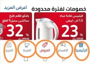 - في أسفل الوجهة الرئيسية لتطبيق كارفور السعودية يمكنك الضغط على الرئيسية أو تصفح أقسام الموقع