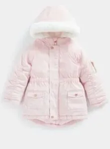 - جاكيت باركا مُبطن باللون الوردي مع قبعة وحافة من الفرو الصناعي الناعم