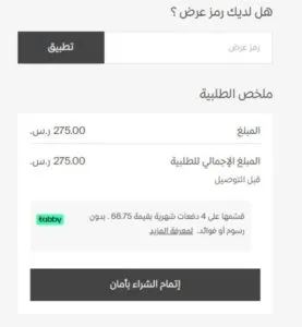 - وفي تلك الخطوة تحديد يطبق العميل كود خصم cos فتقل قيمة مشترياته التي اختارها من المتجر.