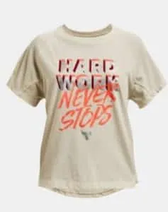 احصلي علي تيشرت عصري لطفلتك من متجر اندر ارمر مصنوع هكذا من القطن يتميز بياقة دائرية واسعة ونصف كم فضلا عن نقشة ملونة عبر الجملة التحفيزية المطبوعة علي التيشرت من الامام. يعرض تيشيرت البنات من ماركة اندر ارمر بسعر 159 ريال.