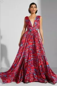 • يطرح المتجر فستان طويل من نمشي X تمارا جمال بتصميم خاص بالمتجر باللون الأحمر المزرقش بسعر 656 ر.س فقط لا غير.